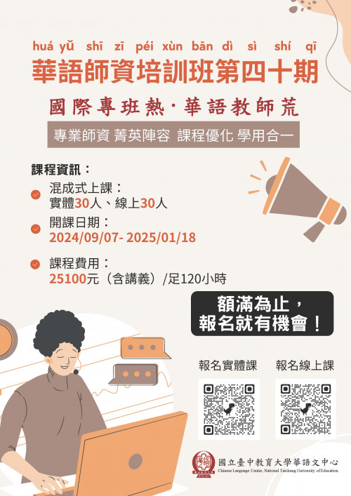 三、適合對象為對華語文教學有興趣者、有意增能第二專長之在學學生及在職教師、計畫移民海外工作者、計畫報考教育部對外華語教學能力認證考試者、計畫打工渡假者。