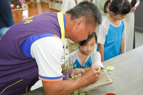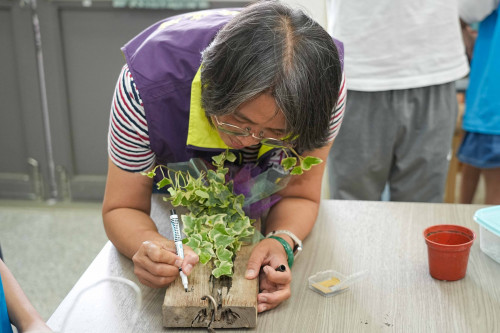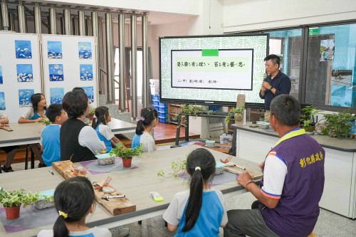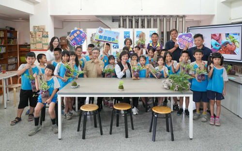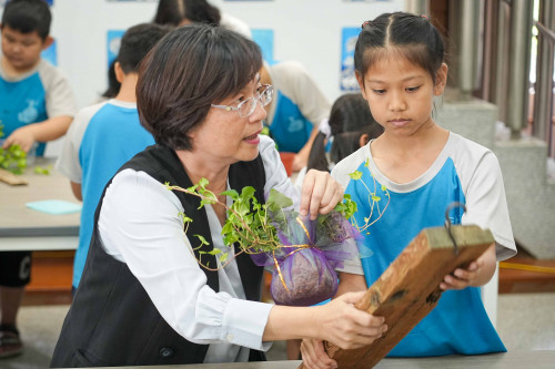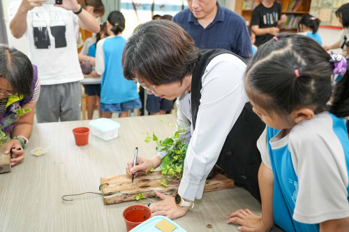 ?縣長媽咪還跟學生一起動手化腐朽為神奇~進行漂流木苔球創作,讓學生體會除了加入減塑的行列外,我們也可以重新創造垃圾的價值,透過海廢的創作來作裝置藝術,為校園增添許多綠意。