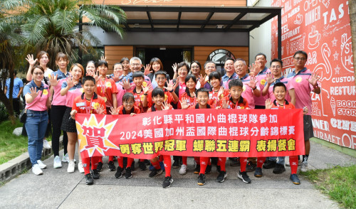 彰化縣平和國小曲棍球隊參加今年「美國加州盃曲棍球分齡錦標賽」,勇奪12歲混合組世界冠軍,成功締造五連霸佳績。為獎勵優秀選手,並感謝學校師長用心付出以及家長會的關心支持,彰化縣長王惠美於今(17)日中午邀請選手、師長等人在西堤牛排彰化四維店共進午餐,表揚且勉勵選手,突破自我,再創佳績,為縣爭光。 |