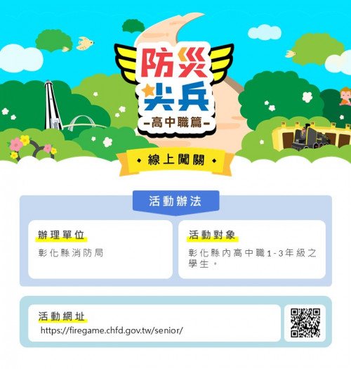 ?「 113年防災尖兵國中及高中職線上闖關」活動開始啦,等你來挑戰 ~ ?你知道安裝熱水器的--五要--是哪五要嗎❓??你知道火災時該如何應變逃生嗎❓ ?你知道家庭兩項最強的防火器是什麼嗎 ❓?快到彰化縣消防局參加防災尖兵線上填答活動。?請大家踴躍參加喔!? 參加對象:1️⃣本縣 #國中1-3年之學生。2️⃣本縣 #高中職1-3年級之學生。?活動網址 :https://firegame.chfd.gov.tw