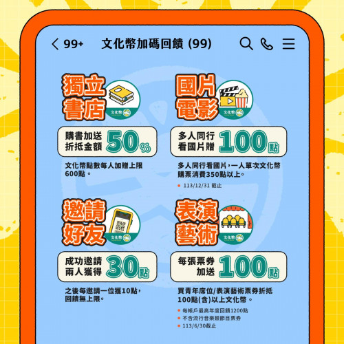 三、文化成年禮金可用於實體的藝文體驗及消費,包含藝文展演及文化體驗、圖書、視聽娛樂、文創工藝等類型,例如看國片、看表演、購書、逛博物館等藝文體驗及消費,另推出獨立書店2點送1點、表演藝術青年席位優惠價、國片結伴觀賞回餽,以及推薦朋友成功領取即贈點等加碼優惠。