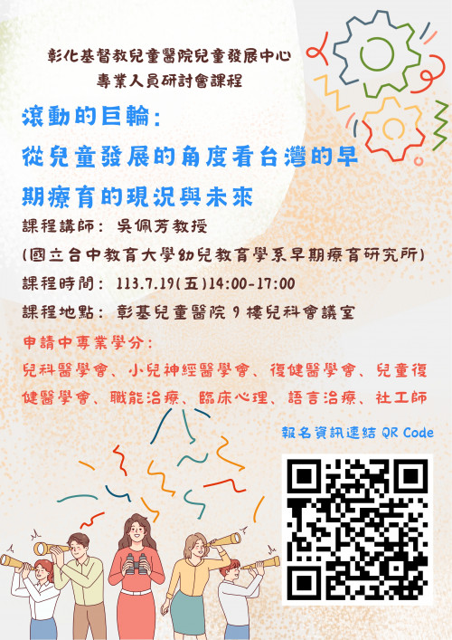 一、 113年度專業人員研討會講座課程表: (一) 課程名稱:滾動的巨輪: 從兒童發展的角度看台灣的早期療育的現況與未來。 (二) 講師:吳佩芳教授(現任國立台中教育大學幼兒教育學系助理教授)。 (三) 活動時間:113年7月19日(五) 14:00-17:00(13:45開始報到)。 (四) 活動地點:本院9樓兒科會議室。 (五) 參加對象:早期療育醫療衛生、教育與社政相關專業人員。 (六) 報名期限:即日起至額滿為止,限額60人。 (七) 報名方式:BeClass線上報名系統。 (八) 課程費用:免費(本經費由國民健康署菸品健康福利捐支應)。 (九) 活動洽詢:TEL:(04)723-8595轉1164,兒童發展中心。 (十) 指導單位:衛生福利部國民健康署、彰化縣衛生局。 (十一) 主辦單位:本院兒童發展聯評中心、本院兒童發展中心。 (十二) 主辦單位保有活動更改之權力,活動過程會拍照製作活動成果,若介意者請先告知。 (十三) 已申請專業學分:兒科醫學會、小兒神經醫學會、復健醫學會、兒童復健醫學會、臨床心理師、語言治療師、職能治療師、社工師。