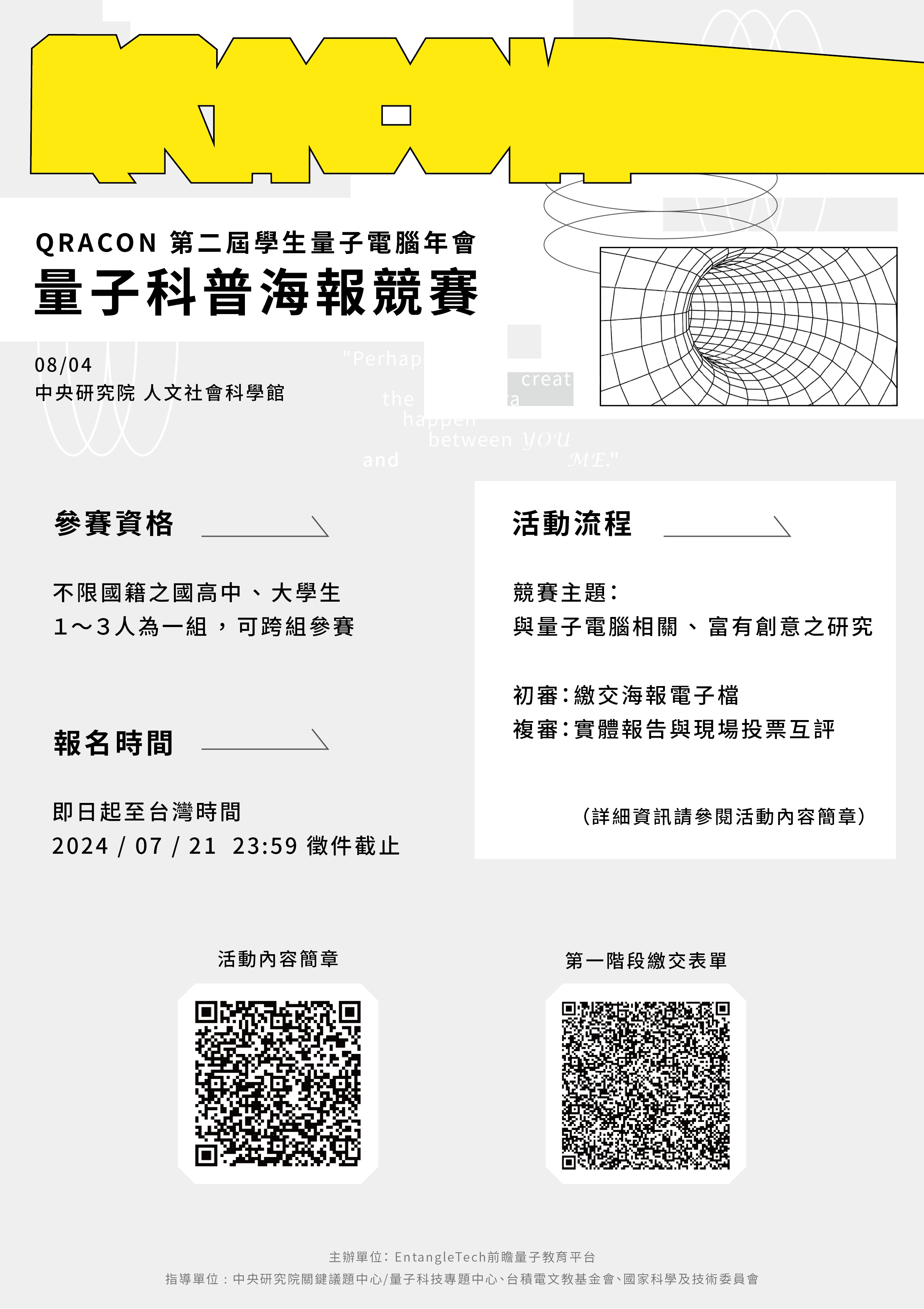 | [類別] 標題 | [11306558] 轉知量子教育平臺辦理之第二屆學生量子電腦年會「量子科普海報競賽」活動海報,歡迎有興趣之國中學生踴躍報名參加,請查照。 |