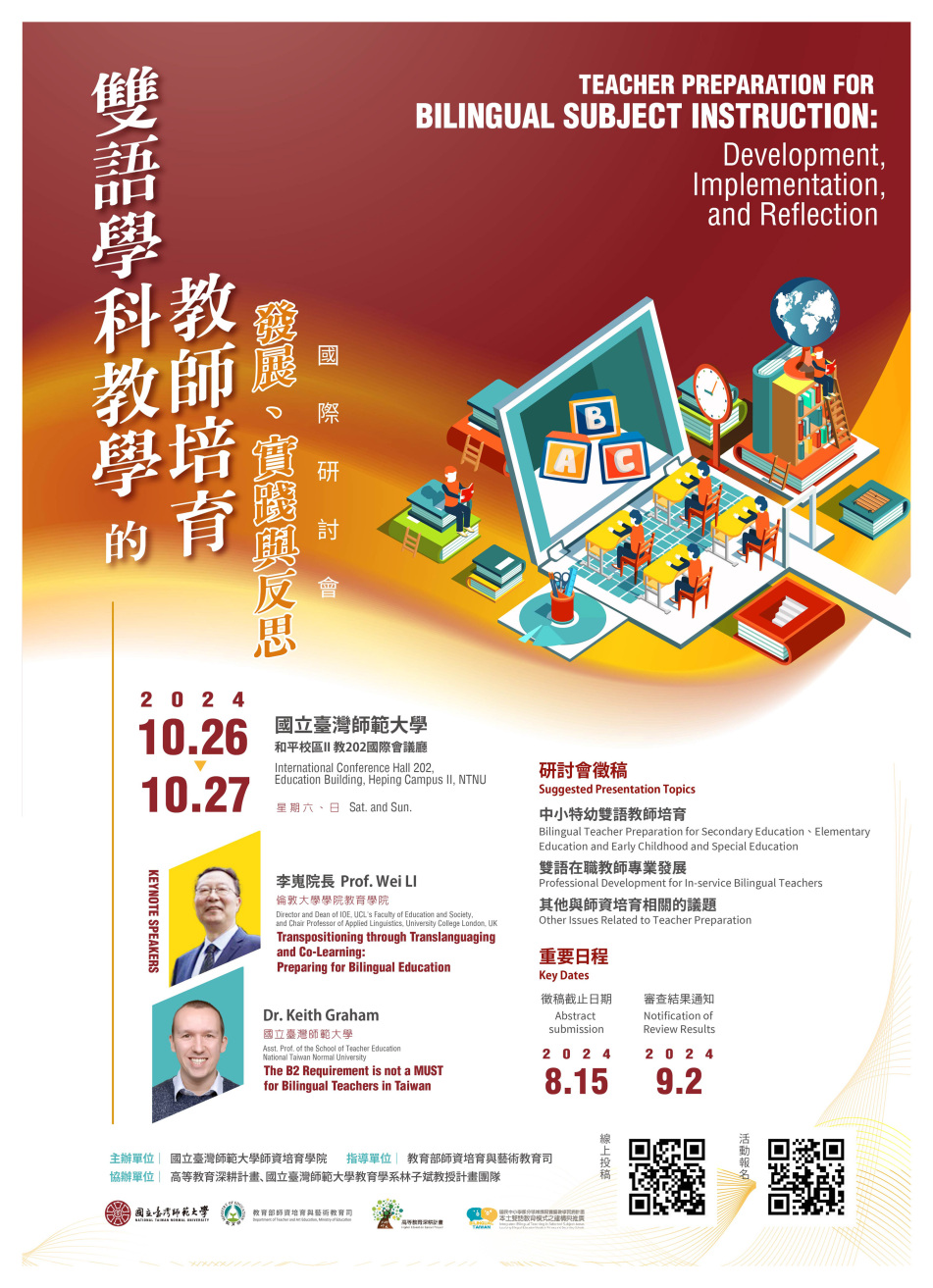 一、依據國立臺灣師範大學113年7月11日師大師課字第1131019388號函辦理。 二、旨揭研討會期透過雙語師資培育「主題演講」、「學科領域工作坊」、「專題論壇」及「論文發表」四面向,為國內外從事雙語師培的教育人員帶來不同觀點,進而優化師資職前教育階段的雙語教師培育歷程,促進學術交流與研討。 (二)三場論壇:「縣市局處對雙語學科教師的需求與看法」、「雙語學科教學」及「IB教育在地化三大主題。 (三)論文發表與海報發表:藉由雙語師培相關論文發表,促進教育工作者齊聚並分享雙語師培之研究與實務。 六、論文投稿方式:採線上投稿,網址:https://reurl.cc/Rq3gRD。 七、論文徵稿期限:即日起至113年8月15日(星期四),徵稿主題如下: 八、詳細投稿及報名相關資訊公告於該校師資培育學院網站(https://tecs.otecs.ntnu.edu.tw/),如有調整依網站公告為準。 九、檢附研討會海報及論文徵稿啟事各1份。 |