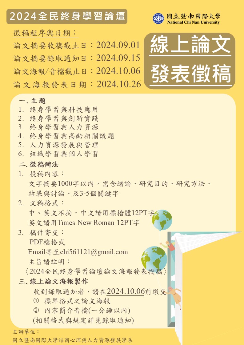 說明: 一、依據國立暨南國際大學113年7月12日暨校終字第1131004470號函辦理。 二、旨揭論文海報以「終身學習與科技應用、終身學習與創新實踐、終身學習與人力資源、終身學習與高齡相關議題、人力資源發展與管理、組織學習與個人學習」為主題,歡迎踴躍投稿。論文摘要投稿截止日為113年9月1日(星期日),正式論文海報/音檔繳交截止日為113年10月6日(星期日)。 三、旨案聯絡人為國立暨南國際大學陳小姐,電子信箱:chi561121@gmail.com。 四、檢送海報1份供參。 |