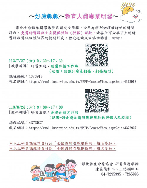 113/8/24(六)9:30~17:30: [教學輔導]113年目睹家暴兒少領航員計畫---創傷知情工作坊(進階:將創傷知情照護運用於教師個人及校園)。 課程編號:4373927 報名網址:https://www1.inservice.edu.tw/NAPP/CourseView.aspx?cid=4373927