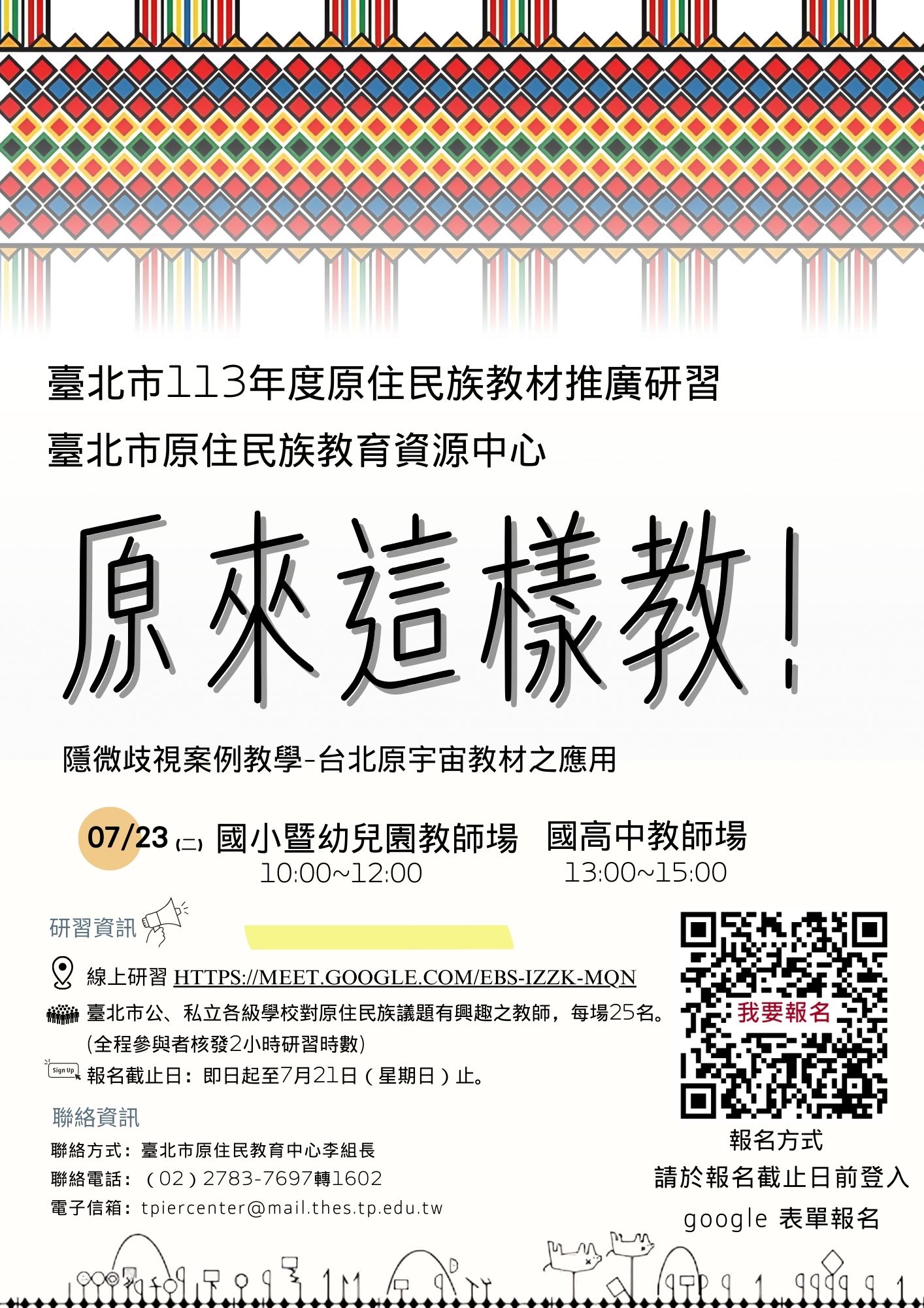 一、依據臺北市南港區東新國民小學113年7月17日北市東新小原字第1136005309號函辦理。 二、研習資訊如下: (一)研習對象 : 全臺高級中等以下學校各領域之正式與代理(代課)教師。 (二)研習時間: 1、國小暨幼兒園教師上午場:113年7月23日(星期二) 10:00~12:00。 2、國高中教師下午場:113年7月23日(星期二) 13:00~15:00。 3、研習地點:線上研習,https://meet.google.com/ebs-izzk-mqn。 4、報名時間:即日起至113年7月21日(星期日)前截止。 5、報名方式: (1)逕至Google報名表單報名(https://forms.gle/wwGXUM33CbGLeEKS6)。 (三)若有相關疑問,請聯繫臺北市原住民族教育資源中心李組長,電話:02-27837697轉1602。 (四)檢附研習計畫與海報。 |