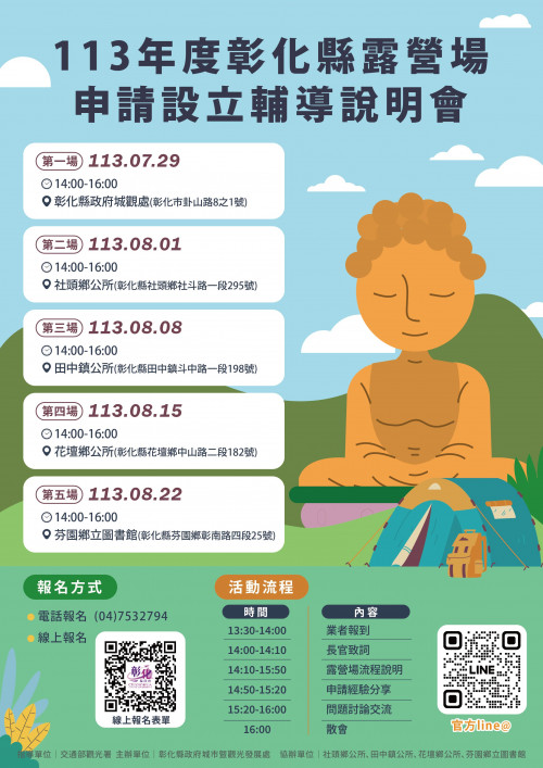 二、為拓展本縣觀光發展並配合中央國土計畫政策,協助有意經營露營場之潛在業者與輔導現有業者取得露營場合法登記,規劃分區辦理5場露營場申設說明會,以提供縣民及旅客優質安全的露營環境。