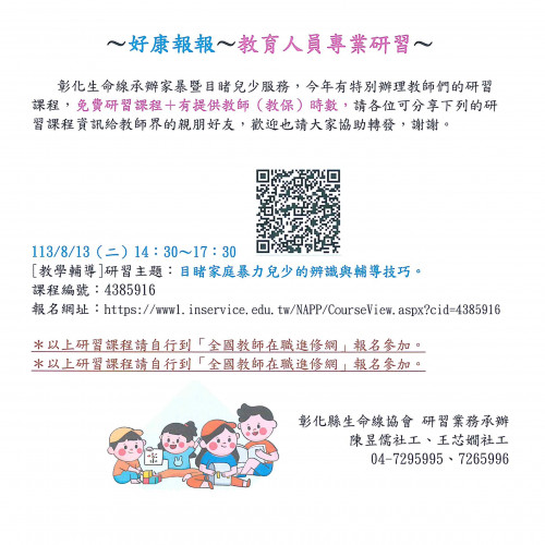 | [類別] 標題 | [11307413] (本活動尚有名額) 08/13(二)「家暴暨目睹兒少服務免費研習課程」,提供教師(教保)時數,鼓勵教師踴躍報名參加,請查照。 |