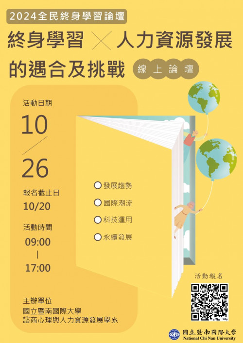 | [類別] 標題 | [11307687] 檢送國立暨南國際大學諮商心理與人力資源發展學系主辦2024全民終身學習論壇:終身學習x人力資源發展的遇合及挑戰之活動海報2份,歡迎踴躍參與,請查照。 |
