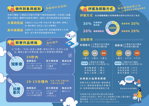 一、依據泛科知識股份有限公司113年8月16日泛科字第2024081602號函辦理。 二、該公司承接國家科學及技術委員會(以下簡稱國科會)第二屆「Open Call科普創意松」,該活動宗旨為培養下一代科普人才,藉由作品交流並導入業師輔導機制,強化學子科學轉譯技術,擴大科普知識影響力,提升全民對科學之興趣。 三、徵件說明如下(請詳見附件及活動官網): (一)報名資格:高中職、大專院校(含專科學校及碩博士)在學學生,或非學校型態實驗教育學生皆可報名。徵件作品主題以「科學」、「科技」為核心議題,參賽類別分為「短影音(59秒內)」及「科學影片(10-15分鐘)」。 (二)本活動採網路報名,徵件期間即日起至本年10月31日下午5時截止。競賽辦法及徵件說明會等詳細資訊請至活動官網(https://www.opencall-nstc.com/)查詢。 (三)如有未盡事宜,請詳閱競賽簡章,或逕洽本活動服務窗口泛科知識股份有限公司,電話:(02)23620699,分機620孫先生、分機185黃小姐。電子郵件信箱:event.panmedia.gmail.com。 |