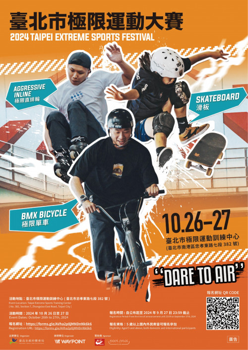 | [類別] 標題 | [11308161] 轉知:臺北市政府體育局訂於113年10月26日至27日辦理「2024年臺北市極限運動大賽」,歡迎踴躍參加,請查照。 | ||