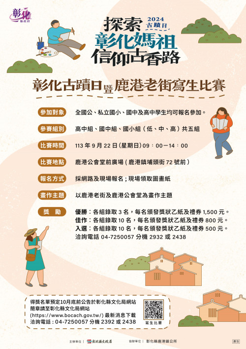 說明: 一、依據本縣文化局113年8月21日彰文資字第1130010066號函辦理。 二、旨揭寫生比賽日期為113年9月22日(星期日)上午9時至下午2時,比賽地點於本縣歷史建築鹿港公會堂前廣場(鹿港鎮埔頭街72號前)。比賽組別分為高中組、國中組、國小組(低、中、高年級)計5組,請各校鼓勵學生踴躍參加。 三、比賽簡章及報名表請至彰化縣文化局網站(https://www.boca ch.gov.tw/)查詢或下載,或洽本局文化資產科蔡先生,電話 (04)7250057分機2438。 四、檢附活動簡章及活動宣傳EDM 各1份。 |