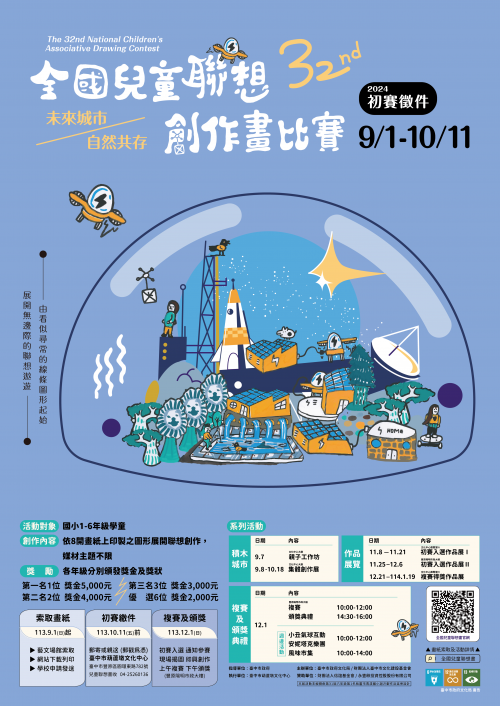 | [類別] 標題 | [11308428] 轉知臺中市政府文化局辦理「第32屆全國兒童聯想創作畫比賽」初賽徵件簡章畫紙及活動海報,歡迎踴躍參加,請查照。 | ||