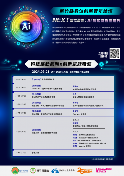 | [類別] 標題 | [11308468] 轉知:新竹縣政府教育局辦理「新竹縣數位創新青年論壇- NEXT躍進未來:AI解鎖職涯新境界」,歡迎踴躍參加。 |