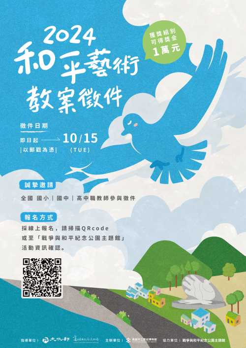 | [類別] 標題 | [11308556] 檢送高雄市立歷史博物館「戰爭與和平紀念公園主題館」辦理「2024和平藝術教案徵件」活動,敬請各校協助公告宣傳並鼓勵有興趣之教師踴躍送件,請查照。 | ||