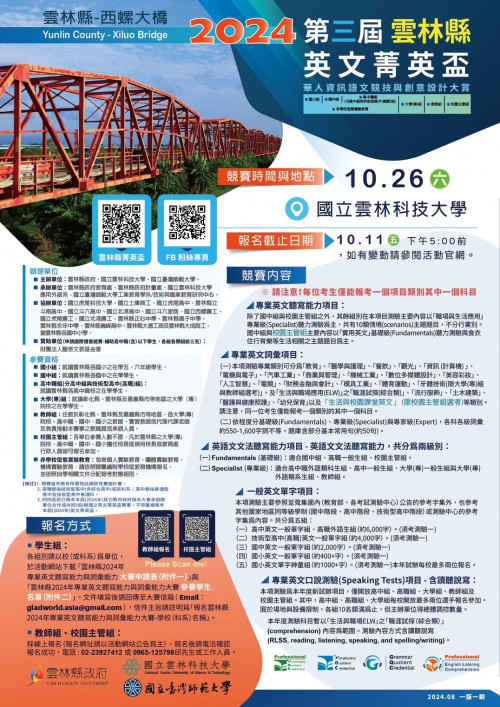 一、依據雲林縣政府113年9月3日府教課二字第1132443500號函辦理。 二、為提升教師雙語教學能力暨瞭解本年度相關大賽重點項目與內容說明,特辦理教師增能與大賽說明研習會1場,研習預計2小時,採取實體研習,請於研習會2日前完成報名,相關訊息如下: (一)研習對象:雲林縣公私立國中、國小暨高中職教師,及彰化縣、雲林縣和嘉義縣市大專院校教師。 (二)報名方式:報名方式:請於 113 年 9 月 9 日(星期五)下午5時前至Google報名表單報名:https://forms.gle/bDTAwc6zhUSgv99V9。 (三)研習時間:113年9月11日(星期三)上午10時至12時。 (四)研習地點:雲林科技大學人文與科學學院(人科一館)DH106(電腦教室A)。 (五)研習代碼: 4559697。 三、檢附研習計畫及雲林縣第三屆英文菁英盃海報1份。 |