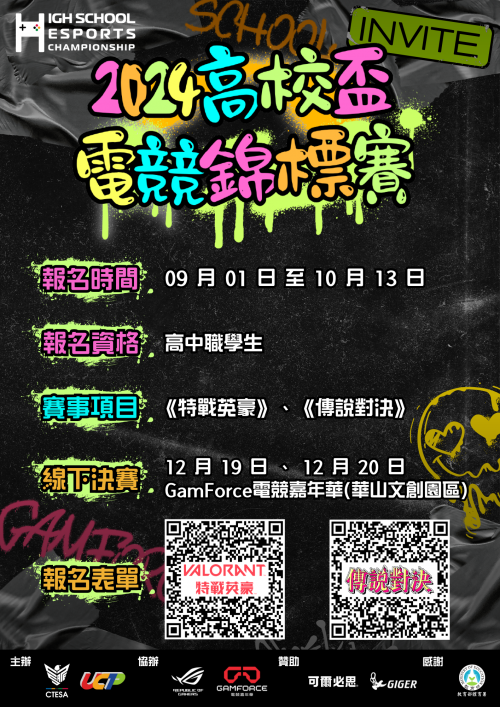 | [類別] 標題 | [11309005] 轉知:中華民國電子競技運動協會主辦「113學年度2024年第四屆高校盃電競錦標賽」,歡迎踴躍參加,請查照。 | ||