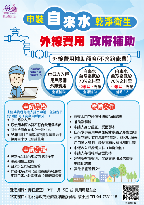 二、旨揭計畫係補助尚未接用自來水之一般住宅,不包含商業用戶,民眾接水完成後即可申請,相關補助計畫及申請書請至本府經濟暨綠能發展處網站(https://reurl.cc/j3RvVy)下載運用。
