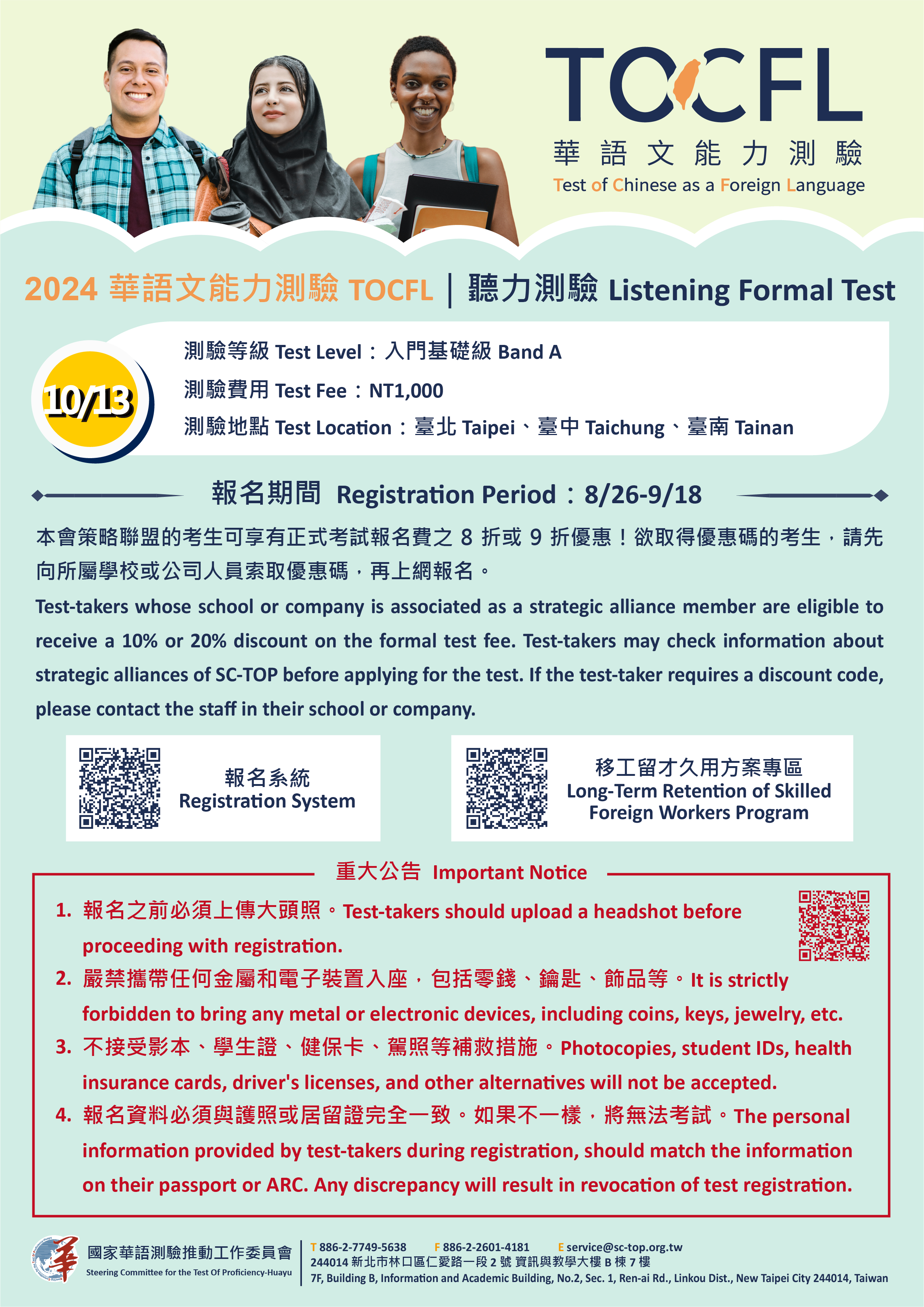 四、報名網址:https://reg.sc-top.org.tw/。 五、線上模擬測驗:https://tocfl.edu.tw/index.php/exam/test/page/19。 |