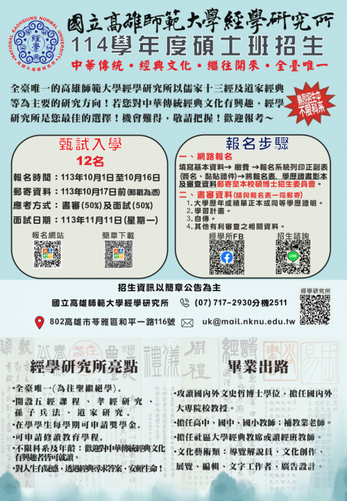 一、依據國立高雄師範大學113年9月19日高師大經研字第1131008196A號函辦理。 二、該校經學研究所日間部碩士班甄試入學招生資訊如下: (一)報名日期:113年10月1日至10月16日止(須於10月16日前報名繳費)。 (二)面試時間:113年11月11日(星期一)。 三、該校招生報名系統:https://sso.nknu.edu.tw/Recruit/front.aspx?RegisterAction=A。 四、聯絡單位:該校經學研究所。 (一)電話:07-717-2930轉2511。 (二)傳真:07-771-3402。 (三)公務信箱:uk@mail.nknu.edu.tw。 (四)網址:https://c.nknu.edu.tw/uk/。 |