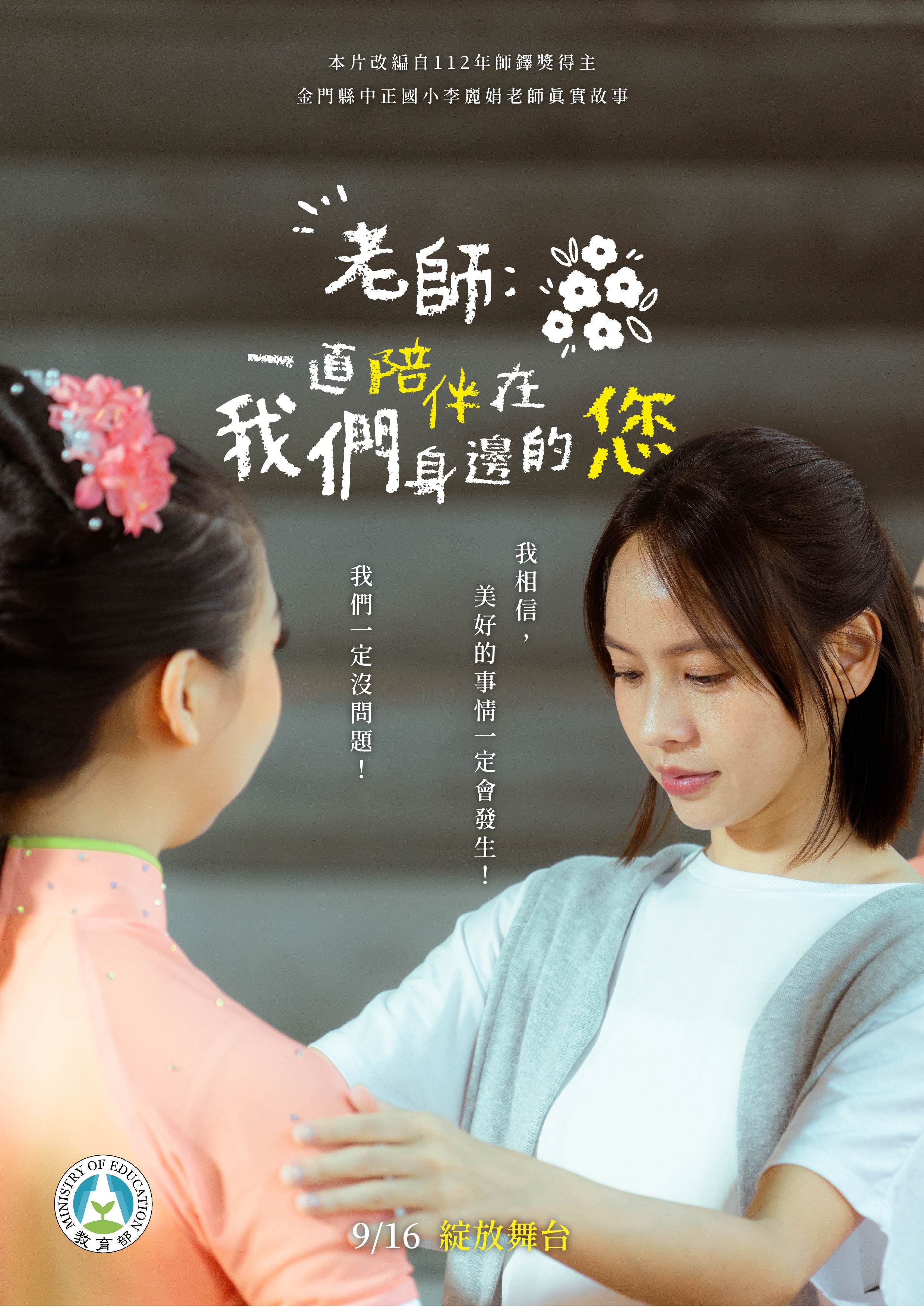 說明: 一、依據教育部13年9月20日臺教師(三)字第1132603178號函辦理。 二、本片改編自師鐸獎得主金門縣中正國小李麗娟老師的經歷,透過教師與學生共同努力、成長之過程,展現教育及陪伴,帶來的改變與力量;本片由知名演員黃姵嘉領銜主演,藉由她與學生的真情演繹,傳遞了「是老師,讓不可能成為可能」的核心訊息,期許觀眾能感受到老師無條件的默默付出,體會老師的辛勞,進而向師長們表達最真摯的感謝。 三、「我永遠都告訴自己,相信美好的事情即將發生,只要堅持下去,不可能都會變成可能,我們一定會創造奇蹟!」113年敬師微電影已上線,歡迎至教育部YouTube頻道觀看《老師:一直陪伴在我們身邊的您》,網路連結如下: (一)微電影:https://www.youtube.com/watch?v=b2C2GTu-QxI。 (二)精華版:https://www.youtube.com/watch?v=FWC1C3paczY。 四、檢送相關海報3份。 |