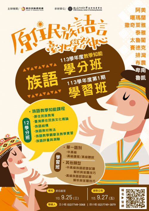 | [類別] 標題 | [11309633] 【轉知】國立臺灣師範大學辦理原住民族語言臺北學習中心「113學年度第1 期族語學分班暨學習班」招生簡章及EDM,請查照。 | ||
