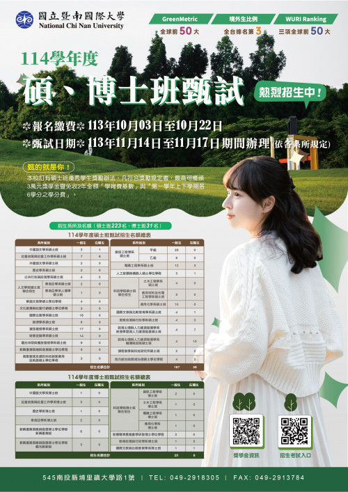二、該校114學年度碩士班及博士班甄試入學招生考試,採網路報名,報名網址(https://exam.ncnu.edu.tw/),詳細報名資訊如下: