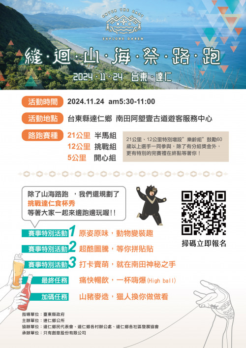 二、臺東縣達仁鄉公所響應政府提倡休閒活動,提升在地觀光產業,藉辦理路跑運動賽事,以推廣運動風氣與達仁山清水秀風光。達仁鄉具全國著名之南田石、阿塱壹古道及排灣族傳統文化,邀請各機關單位組隊參賽,體驗於依山傍水之台26線暢遊漫步。
