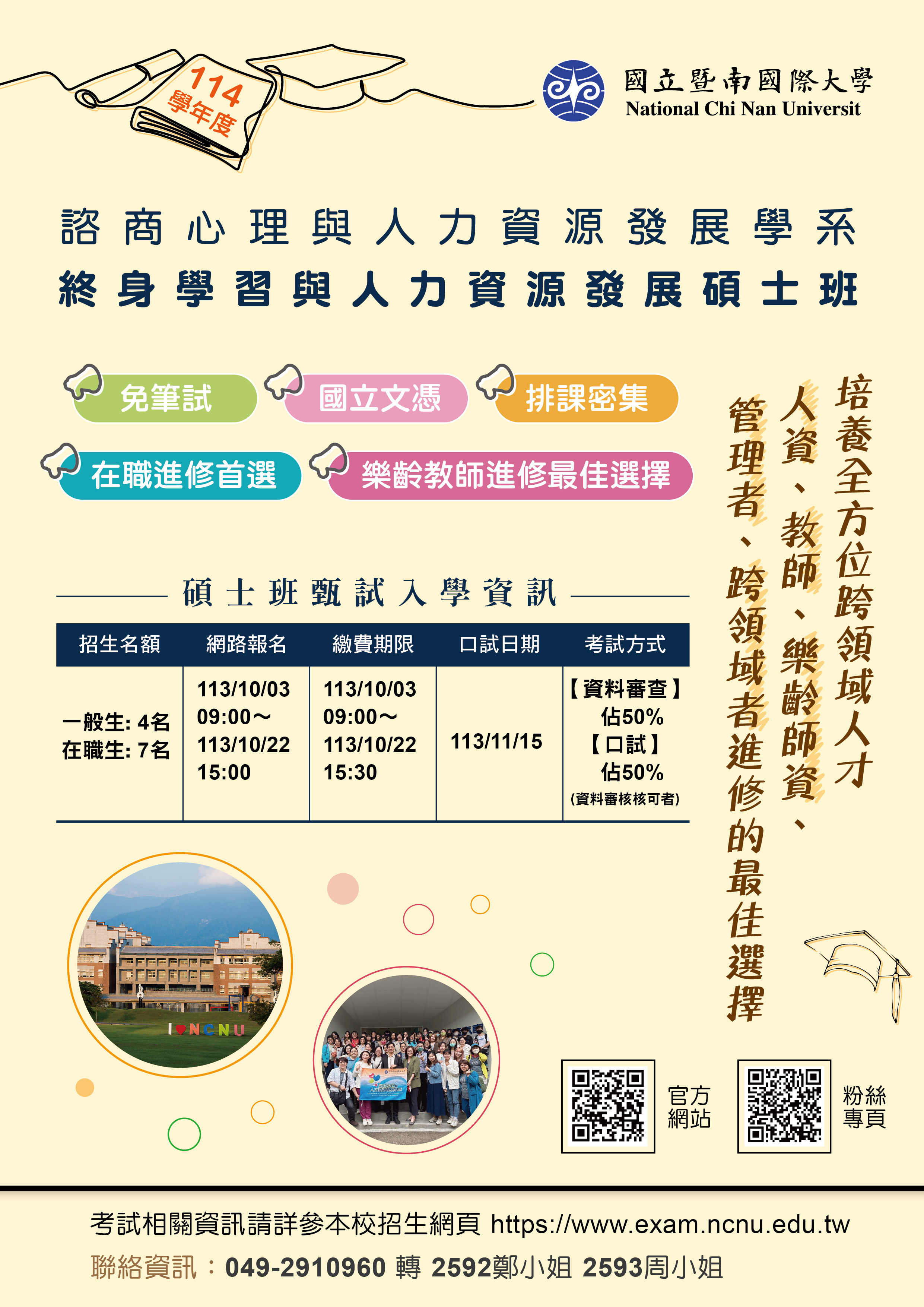 | [類別] 標題 | [11309903] 轉知國立暨南國際大學諮商心理與人力資源發展學系「終身學習與人力資源發展碩士班」114學年度招生。 |
