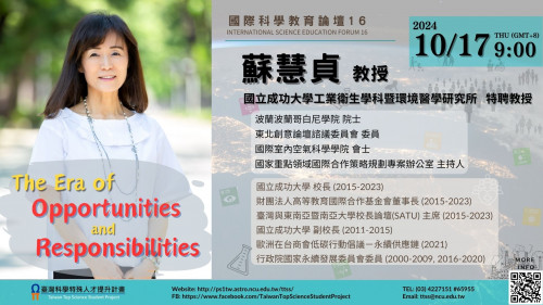 二、本次講座由前成功大學校長蘇慧貞教授主講。現為國立成功大學環境醫學研究所特聘教授,專研生物性氣膠污染、空氣污染健康效應、氣候變遷與公共衛生及永續發展等領域。於2015年起榮任成功大學校長,為創校80餘年以來首位女性校長。