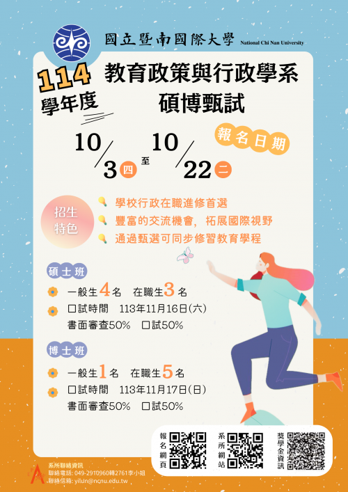 | [類別] 標題 | [11310441] 轉知國立暨南國際大學114學年度「教育政策與行政學系碩博甄試」招生。 |