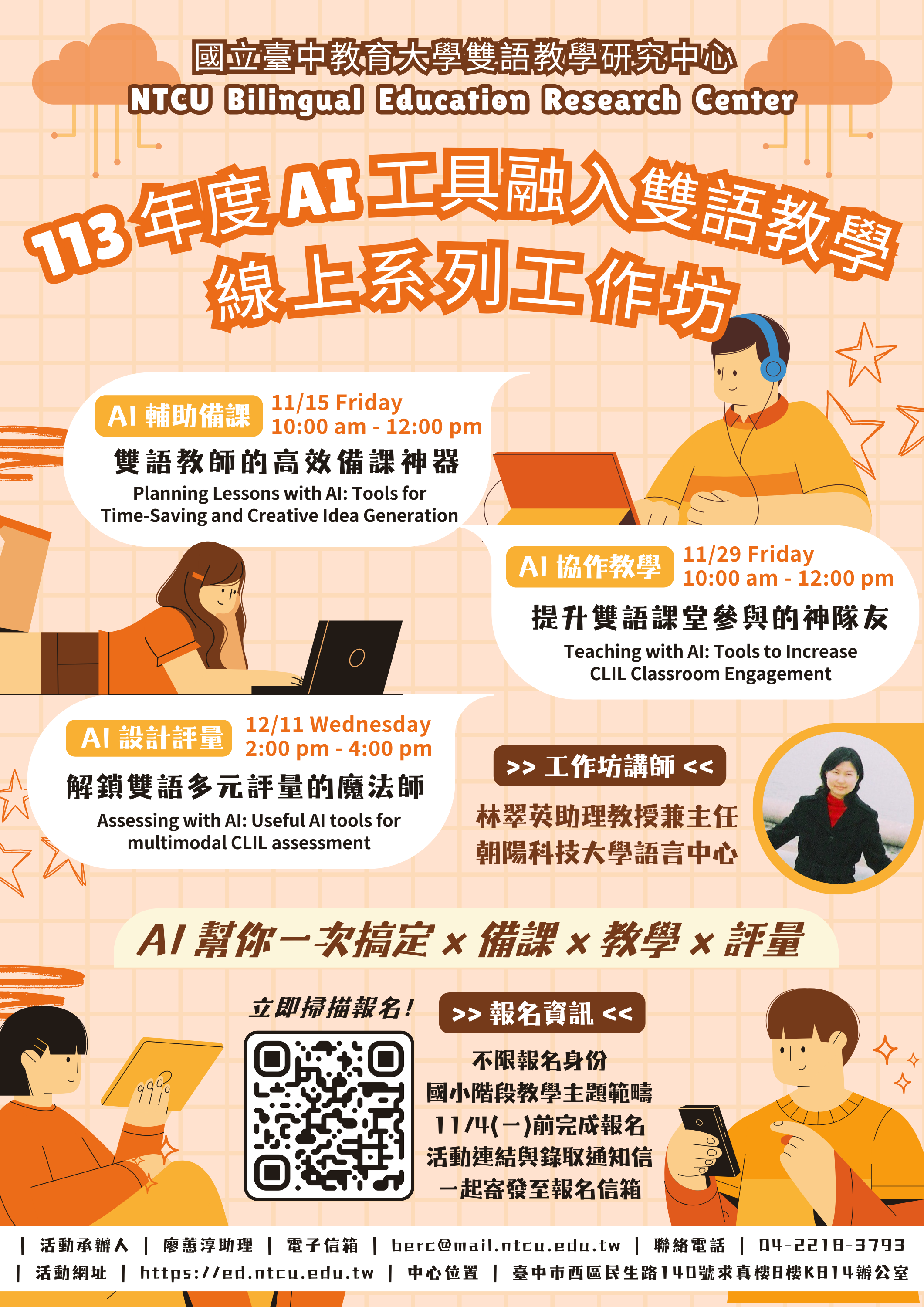 一、依據國立臺中教育大學113年10月15日臺中大學英語字第1133061044號函辦理。 二、活動主旨:為強化國小雙語師資運用AI融入及輔助雙語教育,以提升教學品質與成效,該校雙語中心以「AI融入:雙語教學課程設計」與「AI輔助:共備協作減輕備課壓力」為題,擬辦理3場「AI工具融入雙語教學系列工作坊」。 三、旨揭工作坊資訊如下: (一)講師:林翠英助理教授兼主任/朝陽科技大學語言中心 (二)主持人:洪月女副教授兼系主任/國立臺中教育大學英語學系 (三)地點:Google Meet(活動連結將與錄取通知信一併提供) (四)時間與主題: 1.【AI輔助備課】11月15日(星期五)上午10時至12時,主題:雙語教師的高效備課神器 Planning Lessons with AI: Tools for Time-Saving and Creative Idea Generation。 2.【AI輔助教學】11月29日(星期五)上午10時至12時,主題:提升雙語課堂參與的神隊友 Teaching with AI: Tools to Increase CLIL Classroom Engagement。 3.【AI輔助評量】12月11日(星期三)下午2時至4時,主題:解鎖雙語多元評量的魔法師 Assessing with AI: Useful AI tools for multimodal CLIL assessment。 (五)報名資訊: 1.報名對象:不限報名身份,唯工作坊主題以「國小學習階段」為主要教學討論範疇,請報名者自行斟酌。 2.報名期間:即日起至113年11月4日(星期一)止。 3.報名網址:https://docs.google.com/forms/d/e/1FAIpQLSftvuD6eoGefDJnaGx5iyx8i8f2NWW04XhS_uSd7ks3SFPVyw/viewform?usp=sf_link。 三、請惠允參與人員公(差)假參與活動。 四、如有活動相關問題,請洽承辦人廖助理(電話:04-22183793、電子郵件:hcliao@mail.ntcu.edu.tw)。 五、檢附工作坊宣傳海報1份。 |