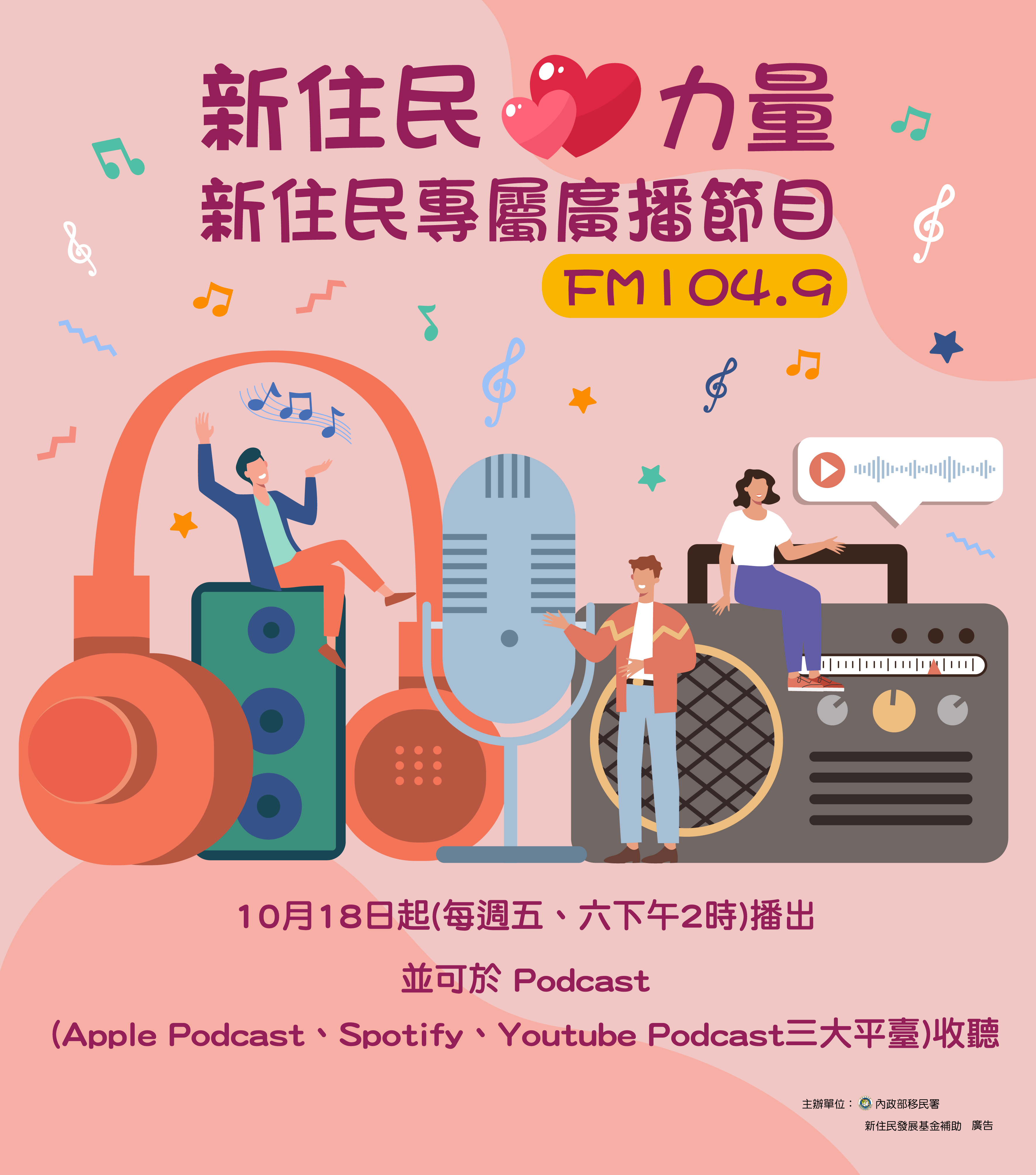 說明: 一、新住民基本法經立法院於113年7月16日三讀通過,並經總統於113年8月12日制定公布,依據該法第17條規定,政府應鼓勵各媒體事業,製播新住民語言文化之廣播、電視節目或影音,以保障新住民媒體近用權。 二、為落實前開條文規定,內政部移民署爰委託財團法人中央廣播電臺(下稱央廣)製播旨揭廣播節目,自113年10月18日起之每星期五、六下午2時,於內政部警政署警察廣播電臺FM104.9頻道各播出1集,預計製播78集;另亦可透過網際網路於央廣全球資訊網及Apple Podcasts、Spotify及Youtube Music等Podcast平台收聽,請惠予協助透過多元管道推廣宣導,鼓勵新住民及民眾踴躍收聽。 三、檢附「新住民心力量」廣播節目宣導圖卡2份。 四、本案聯絡人:內政部移民署張䧥方辦事員,電話:(02)2388-9393分機2526。 |