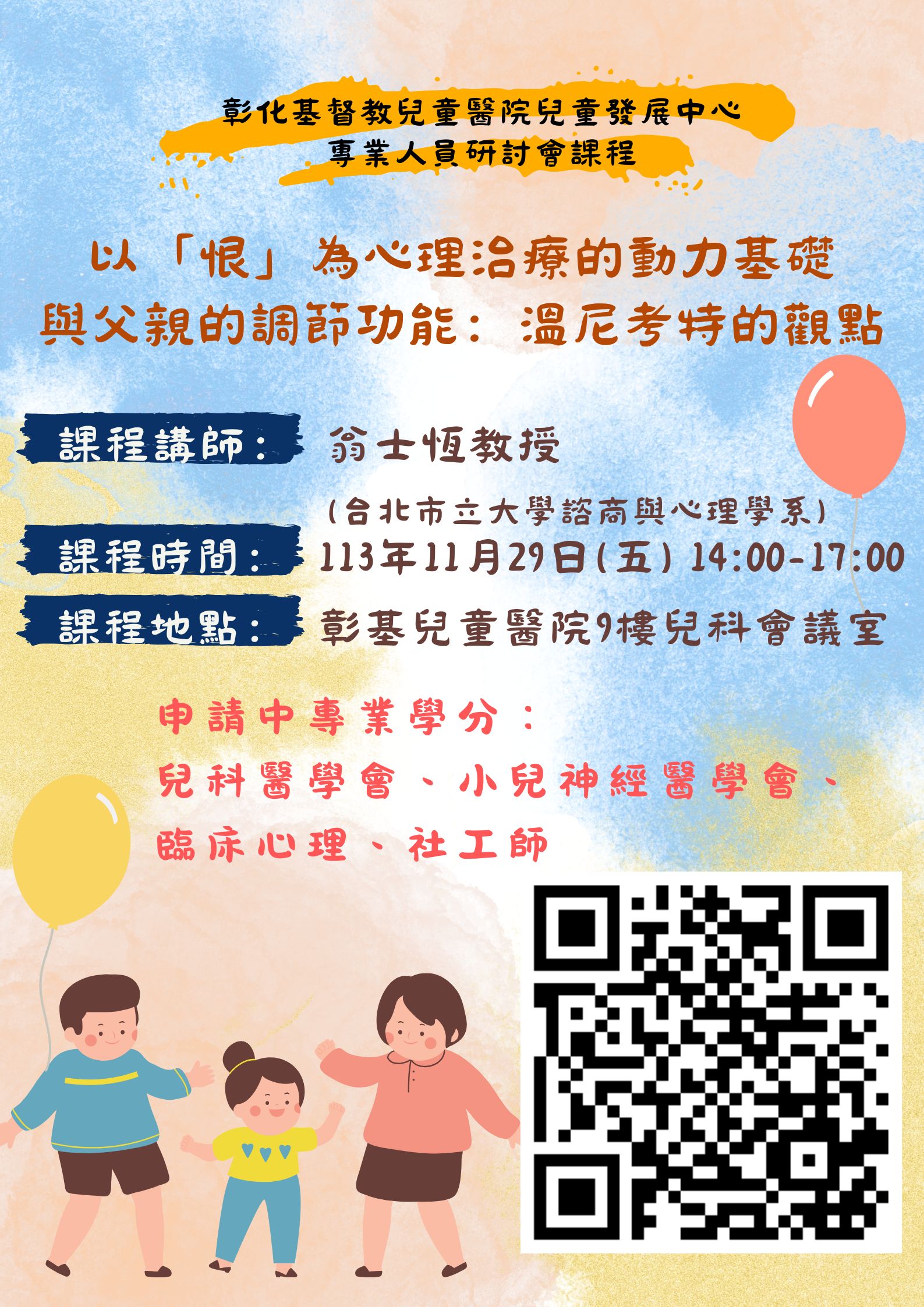 檢送本院兒童發展中心於113年11月29日舉辦早療專業人員培訓研討會課程-以「恨」為心理治療的動力基礎與父親的調節功能:溫妮考特的觀點,報名訊息請廣為宣傳周知並鼓勵醫師、心理師、語言治療師、職能治療師、物理治療師與各早療專業人員報名參加,請查照。