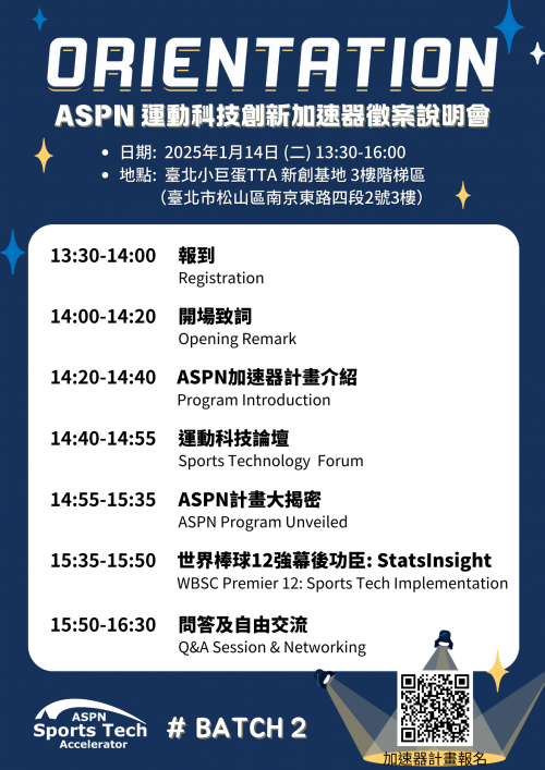 (五)本次徵案說明會特別邀請於今年計畫成果發表會中獲得「體育署獎」及「ASPN獎」,亦為世界棒球12強中華隊情報蒐集團隊-灼見運動數據(StatsInsight)創辦人徐樂,分享運動創新科技與賽事結合案例。