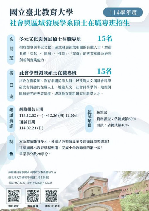 | [類別] 標題 | [11312472] 轉知國立臺北教育大學社會與區域發展學系114學年度多元文化與發展碩士班在職專班(夜間)及社會學習領域碩士在職專班(週末假日)招生。 |