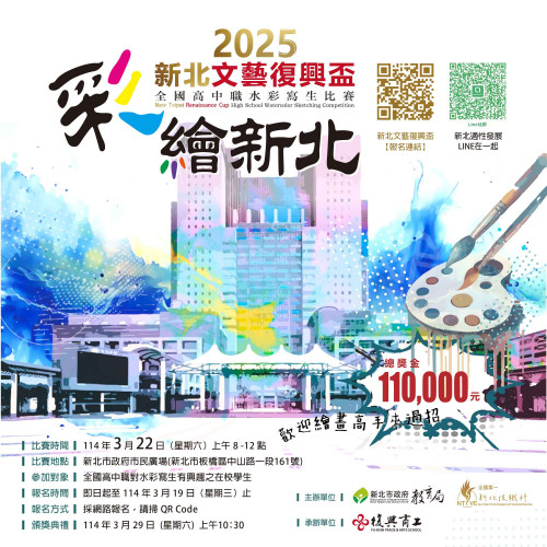 | [類別] 標題 | [11400031] 轉知2025「新北文藝復興盃全國高中職水彩寫生比賽」實施計畫1份暨電子海報(EDM)2式,歡迎踴躍報名參加,詳如說明,請查照。 |