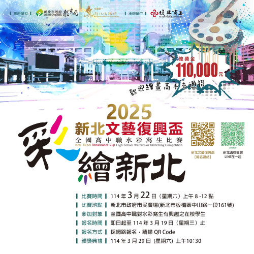 說明: 一、依據新北市政府教育局114年1月2日新北教技字第1132605621號函辦理。 二、本案以「文藝復興」作為繪畫活動核心精神,地點安排於新北市市民廣場,期待讓科技時代下的孩子能夠走出戶外,培養實際寫生能力,感受新北市城市人文風情。並藉此活化美感實踐力,提升學生美感素養,激發繪畫潛能,成就國家未來新銳藝術家。 三、有關活動訊息如下: (一) 競賽時間:114年3月22日(星期六)上午8時至12時。 (二) 競賽地點:新北市政府市民廣場 (新北市板橋區中山路1段161號)。 (三) 參賽對象:全國高中職對繪畫寫生有興趣之在校學生。 (四) 報名方式:即日起至114年3月19日(星期三)止。一律採網路報名,報名網址為:https://www.beclass.com/rid=294da7e67173b81a45ac。 四、本案如有相關疑義,請洽復興商工教務處教學組陳組長,聯絡電話:(02)2926-2121分機206。 五、檢附實施計畫及EDM各1份。 |