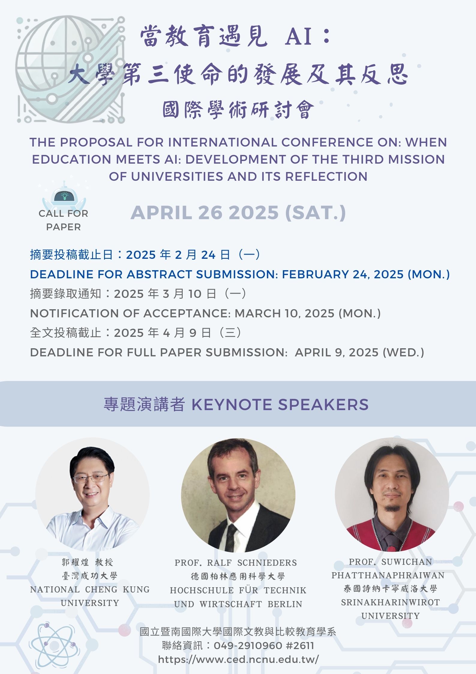 | [類別] 標題 | [11400044] 檢送國立暨南國際大學國際文教與比較教育學系辦理2025年「當教育遇見AI:大學第三使命的發展及其反思」國際學術研討會徵稿海報,請轉知有興趣之教師踴躍投稿,請查照。 | ||