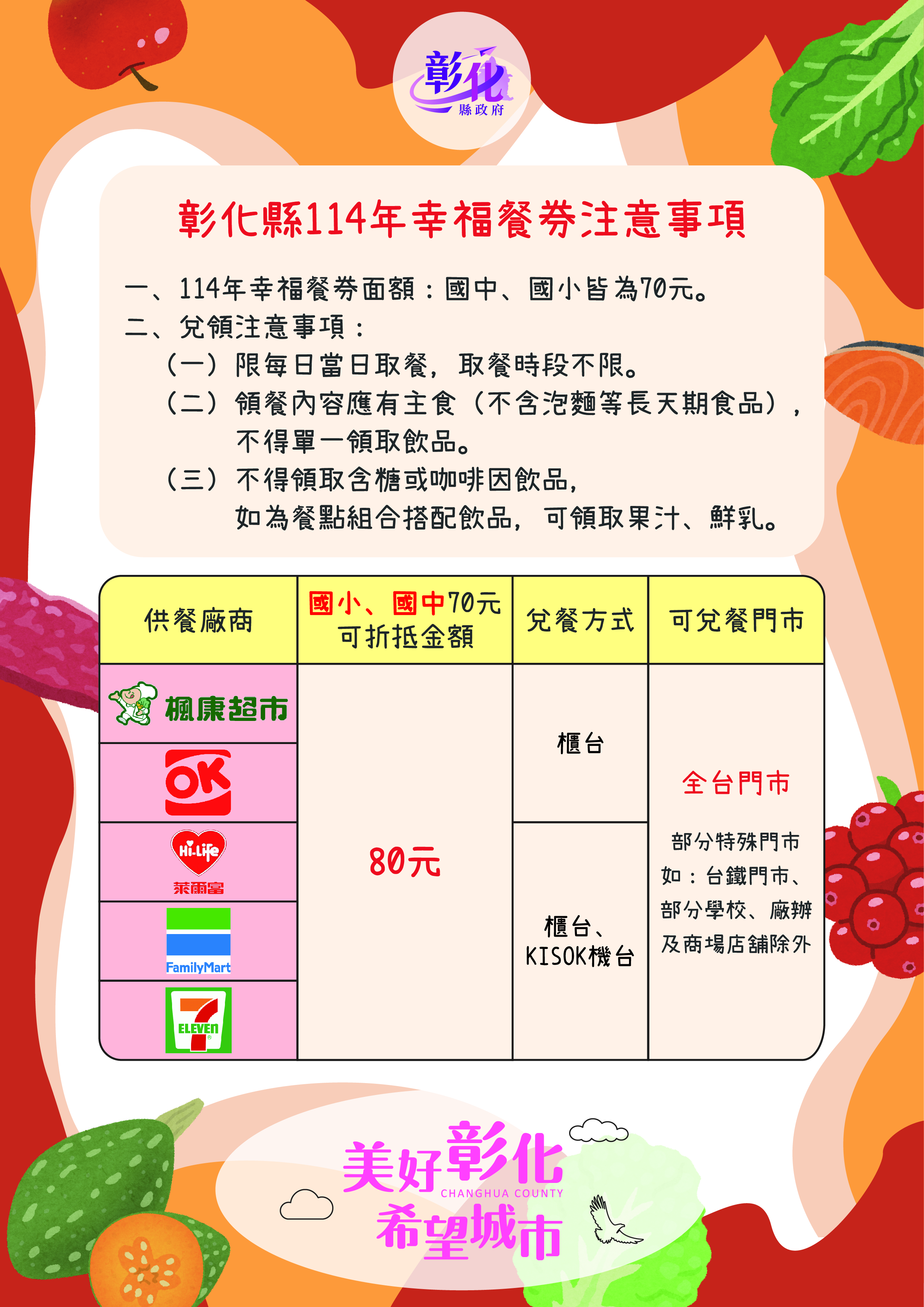 檢附「彰化縣114年度幸福餐券注意事項」1份。 |
