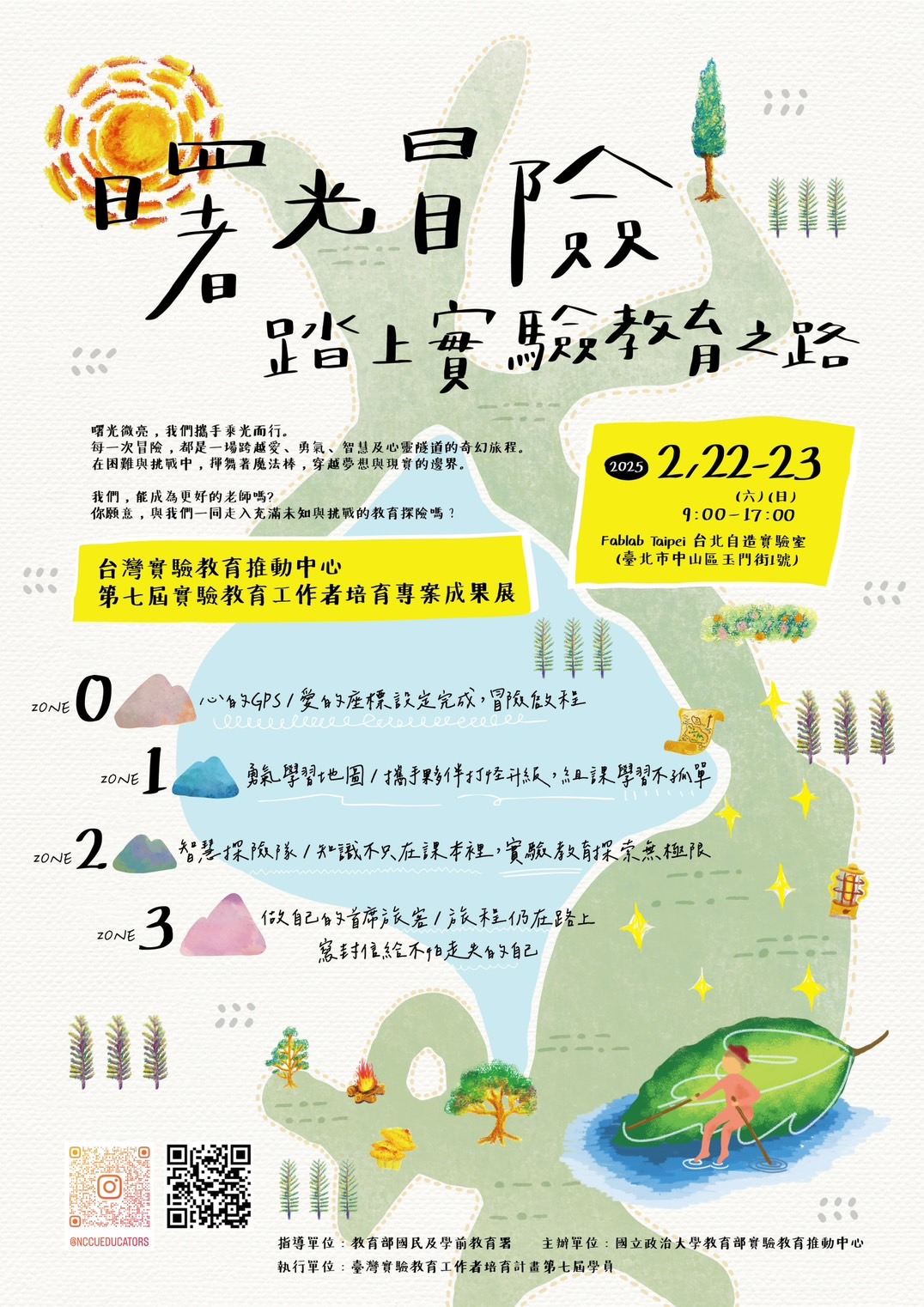 一、依據國立政治大學114年2月13日政系教字第1140003259號函辧理及教育部國民及學前教育署委託該校教育學院鄭同僚兼任副教授執行之「113年度教育部實驗教育推動中心計畫」附屬之「實驗教育工作者培育專案」辦理;本屆培育專案已近尾聲,為促進各項實驗教育理念擴散、推廣、交流,於近日辦理成果展,展現本年度培訓之成果。 二、成果展相關資訊如下: (一)日期:114年2月22日(六)~114年2月23日(日) 三、若有相關活動疑問,請洽承辦人汪暐嵐小姐,電話02-29393091#62340,Email:educators@teec.nccu.edu.tw,https://www.facebook.com/TaiwanExperimentalEducationCenter/ |