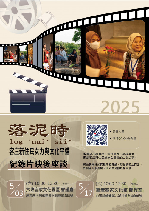 一、本府114年4月18日府社婦民字第1140149546號函辦理。 二、為消除族群文化刻版印象,促進臺灣多元文化,該中心拍攝《落泥時》影片,記錄花蓮鳳林、新竹關西、高雄美濃三地客庄新住民女性深根臺灣發展的過程。 三、客家委員會客家文化發展中心訂於114年5月辦理該紀錄片映後座談活動,邀請影片受訪者,及相關學者專家等,共同分享拍攝過程與心得,放映資訊說明如下: (一)第一場次: 1.時間:114年5月3日(星期六)上午10時至12時30分。 2.地點:六堆客家文化園區會議廳(屏東縣內埔鄉建興村信義路588號)。 (二)第二場次: 1.時間:114年5月17日(星期六)上午10時至12時30分。 2.地點:臺灣客家文化館簡報室(苗栗縣銅鑼鄉九湖村銅科南路6號)。 四、檢附活動電子海報,網路報名連結:https://gov.tw/mzy。 五、活動提供全程參加之公務人員學習認證時數2小時。 六、聯絡人:客家委員會客家文化發展中心戴正倫助理編審,電話:(08)7230100分機204。 |