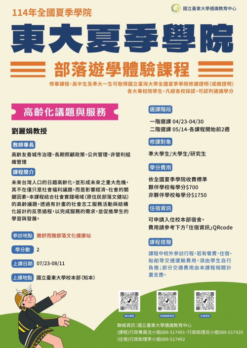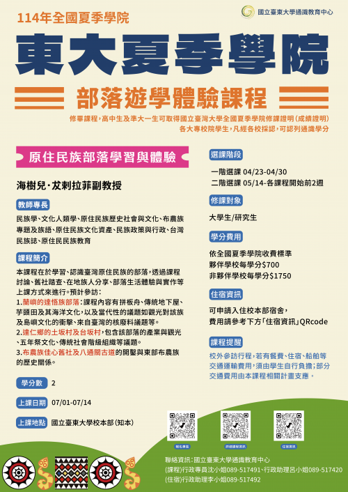 二、旨揭活動為國立臺東大學夏季學院開辦之「部落遊學體驗課程」,以協助推動全民原教,歡迎高級中等學校原住民學生及非原住民學生報名參加,課程結束後可取得國立臺灣大學頒發之修課證明。