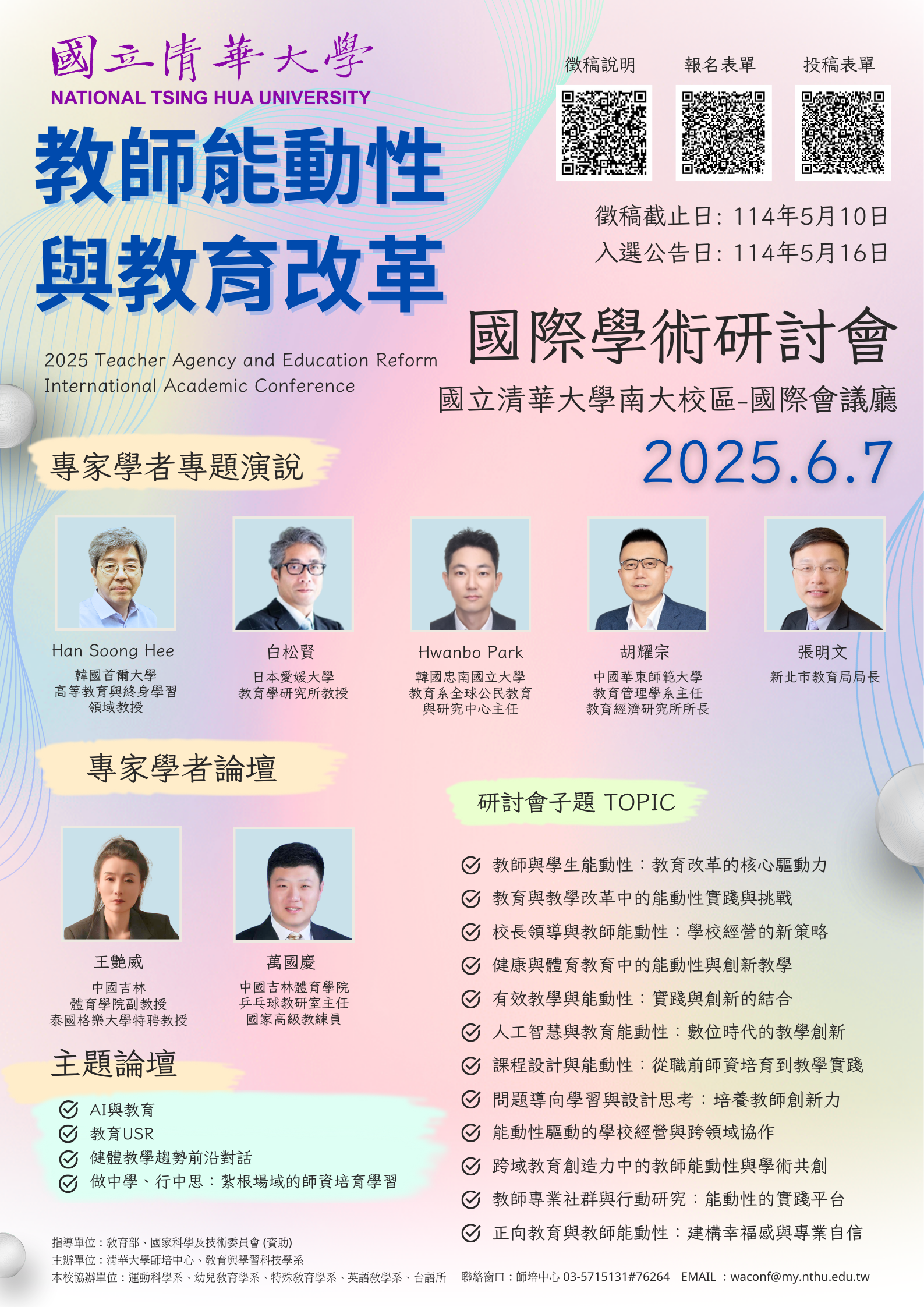 | [類別] 標題 | [11404184] 【轉知】國立清華大學師資培育中心訂於114年6月7日(六)辦理「教師能動性與教育改革」國際學術研討會,徵稿期限延至114年5月10日,敬請有意願參加之教師踴躍參與,請查照。 |