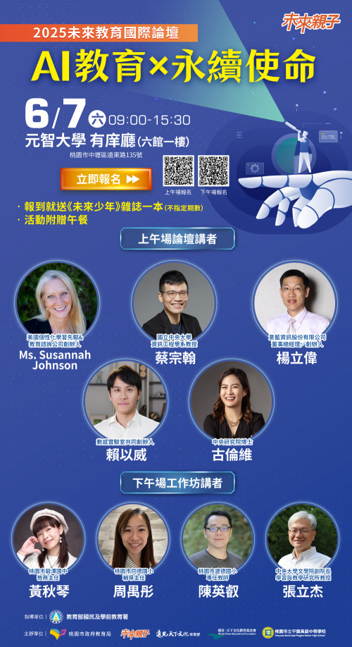 一、依據桃園市政府教育局114年4月29日桃教高字第1140037397號函辦理。 二、為讓教師了解如何培育學生成為具備AI素養、永續意識的世界公民與全球競爭力的未來人才,特舉辦「2025未來教育國際論壇」,期望藉由此論壇的舉辦,分享桃園在智慧教育領域的推動成果與願景,開啟更多關於未來教育願景與實踐路徑的對話,攜手打造更智慧、更永續的教育生態系,展現桃園作為智慧教育標竿城市的決心與實踐。 三、旨揭活動相關資訊說明如下:
