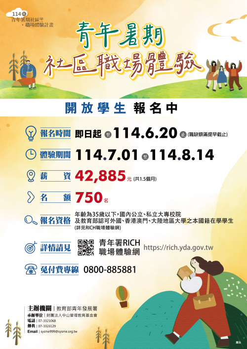 一、依據財團法人中山管理教育基金會114年5月2日(114)中企訓字第1140000197號函辦理。 二、為增進青年了解職場,及早規劃職涯,財團法人中山管理教育基金會辦理教育部青年發展署旨揭計畫,於暑假期間至全臺社區產業、社會公益相關之非營利組織進行職場體驗,提供大專以上在學青年具學習性之750個體驗機會,協助提升就業力與職涯規劃能力,並學習社會責任意涵;另一方面以所學專業知能、創意活力,促進地方活化及社區永續發展。 三、檢附本計畫開放學生報名DM如附件,並可至教育部青年署「RICH職場體驗網」(https://rich.yda.gov.tw/)-暑期社區職場體驗-職缺列表查詢相關職缺及投遞履歷。體驗期間為7月1日至8月14日止,由教育部青年署提供每人每月薪資28,590元;1.5個月合計42,885元。 四、本計畫承辦單位:財團法人中山管理教育基金會,承辦專員:黃小姐、邵小姐、李小姐聯絡電話:07-332-1068 #54、57、61,免付費專線:0800-885-881,傳真:07-3323129,電子信箱:sysme999@sysme.org.tw。 |