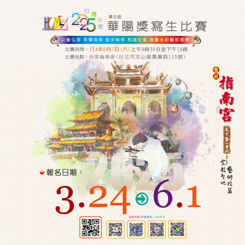 說明: 一、依據指南宮114年4月22日(114)指南文字第013號函辦理。 二、本比賽報名時間:自公告日至114 年 6 月 1 日截止。採網路報名,詳情請見報名網站: https://reurl.cc/Q5zk62。 三、檢附相關資料1份。