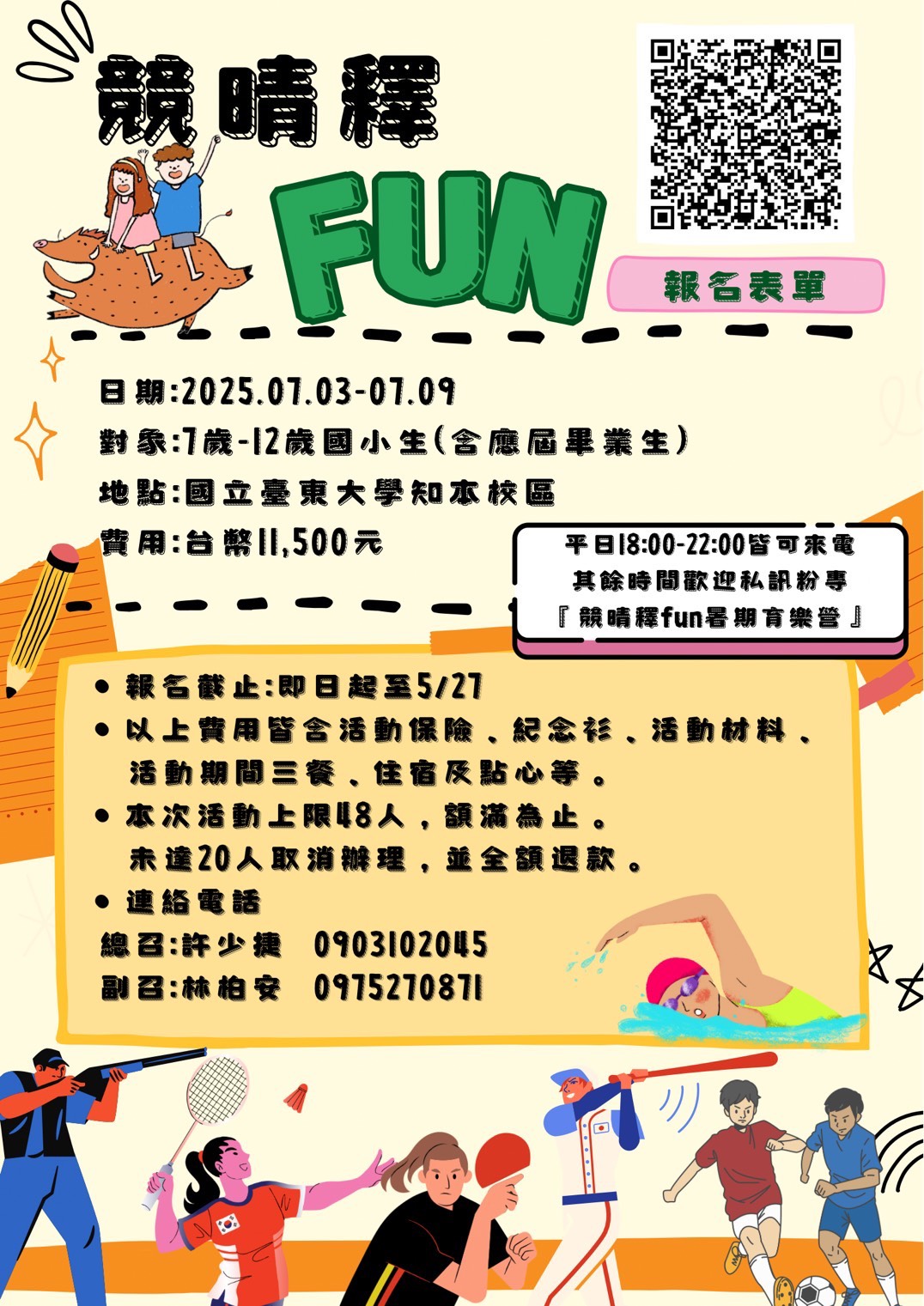 | [類別] 標題 | [11404538] 轉知:國立臺東大學競技與運動科學學系系學會辦理暑假營隊活動「競晴釋FUN 拼盡全力!選手們的奇幻冒險」,歡迎踴躍參加,請查照。 | ||