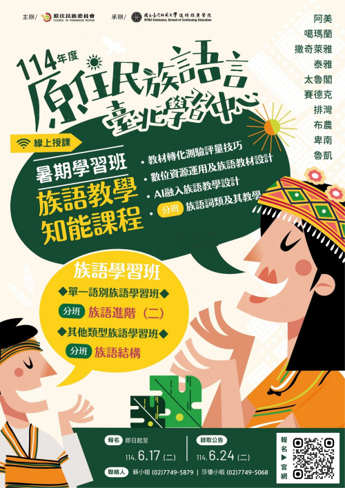 | [類別] 標題 | [11405559] 【轉知】國立臺灣師範大學辦理原住民族語言臺北學習中心114年度暑期「教學知能課程學習班」、「族語學習班」招生簡章及EDM,請查照。 | ||